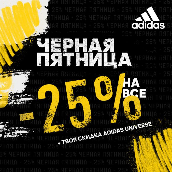 с 28 ноября по 1 декабря Черная Пятница во всех магазинах adidas! Успей купить все со скидкой -25%. Скидка adidas Universe суммируется!